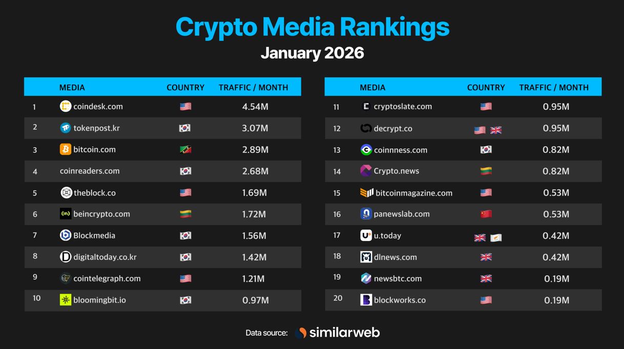 TokenPost (tokenpost.kr), Korean edition of TokenPost and South Korea's leading crypto media outlet, has secured the second position in global crypto media traffic rankings for January 2026. This achievement comes amidst a period of heightened volatility in the digital asset market, demonstrating the platform's growing international influence.